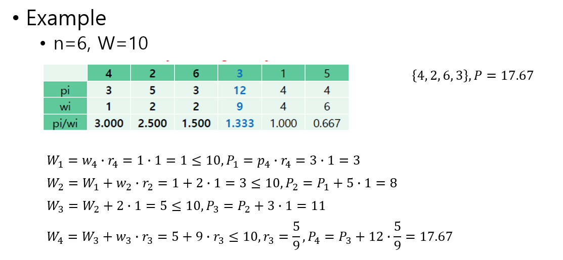 - 매 iteration마다 현재 남아있는 item들 중 “profits per unit weight”가 가장 큰 item을 W가 넘지 않을 만큼 가져온다.
