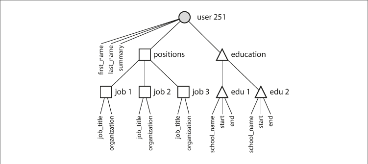 이를 관계형 스키마를 통해 저장할 경우 positions, education, contact_info 각각 모두 요소마다 row를 생성해야 하고 user_id와 연결해야 한다. (일대다)