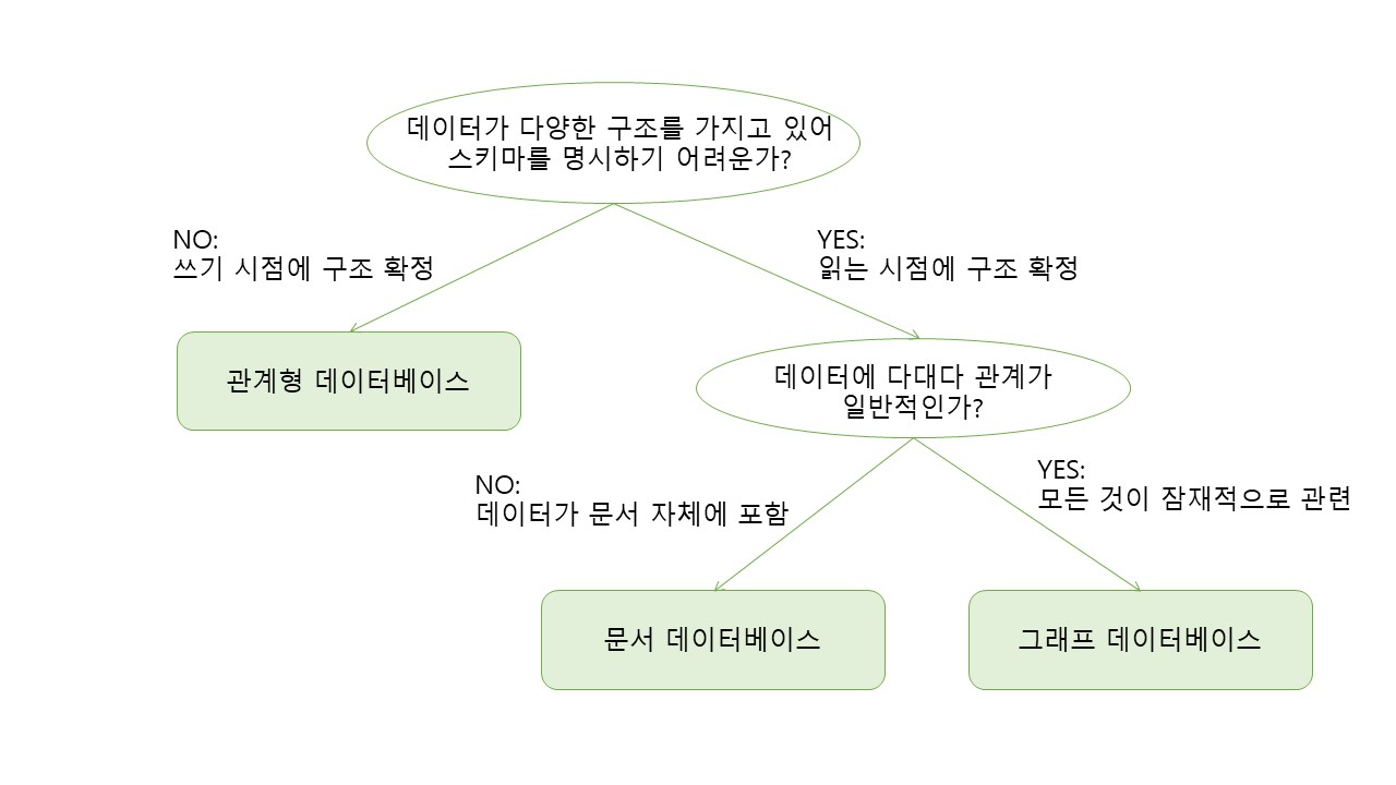 다양한 데이터 모델과 질의 언어가 존재하지만 책에 나온 관계형, 문서, 그래프 데이터베이스의 대표적인 특징을 기반으로 데이터 특성에 따라 어떤 데이터 모델이 적합한지 표현해보면 위와 같이 표현해볼 수 있을 것 같다.